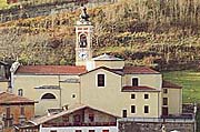 La facciata è liscia a due ordini, il portale architravato è in marmo bianco di Vezza e il campanile è del 1713.