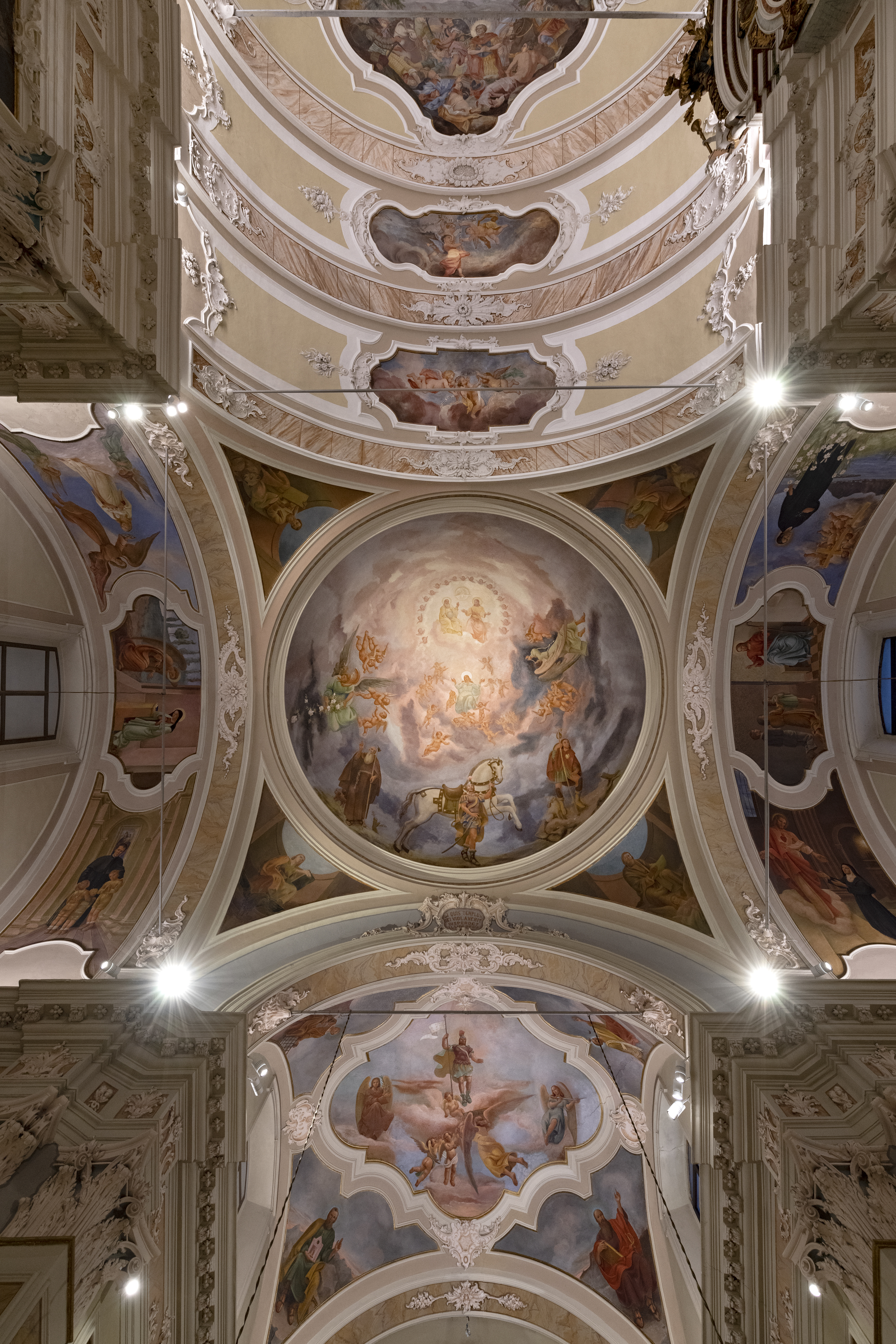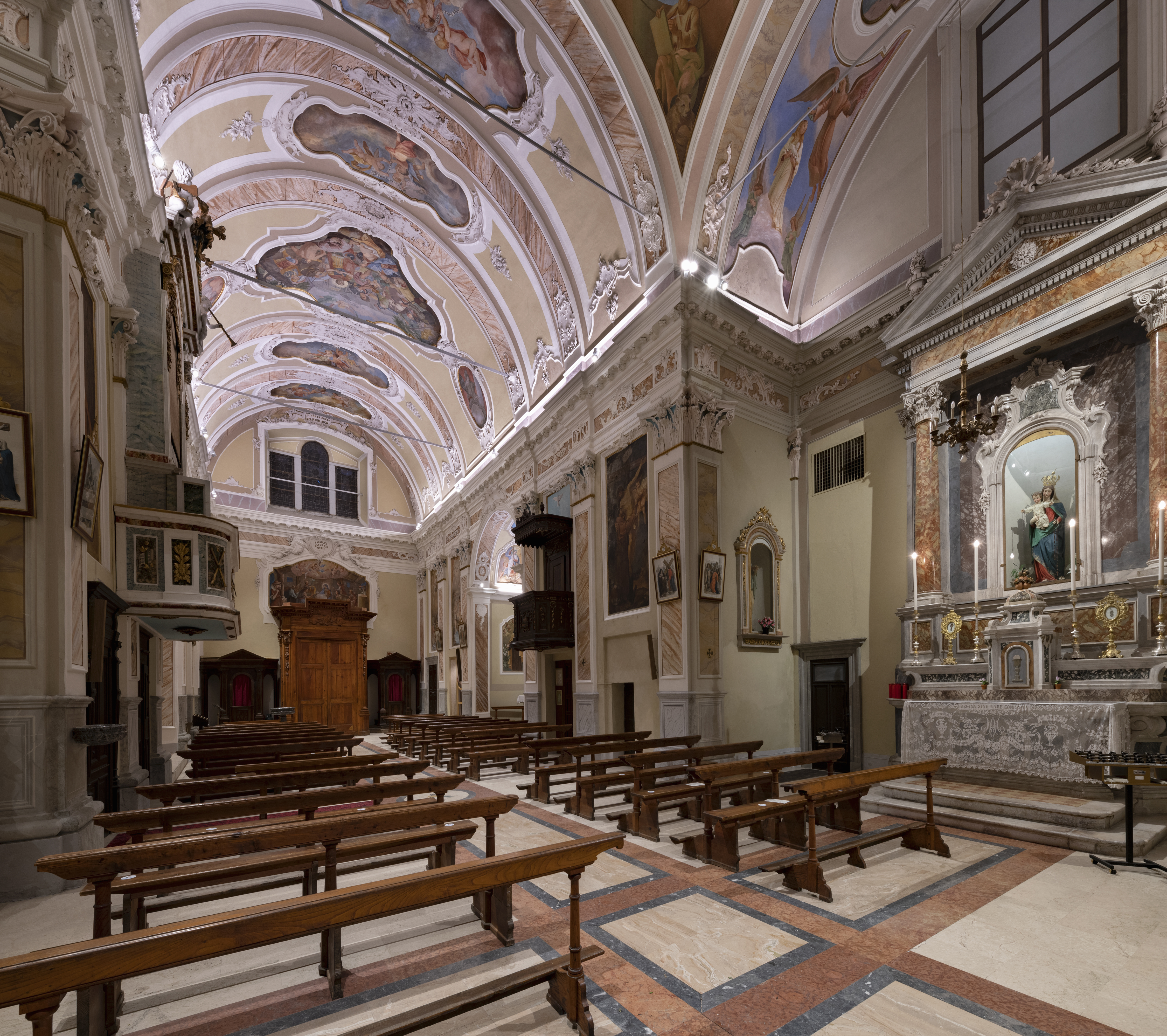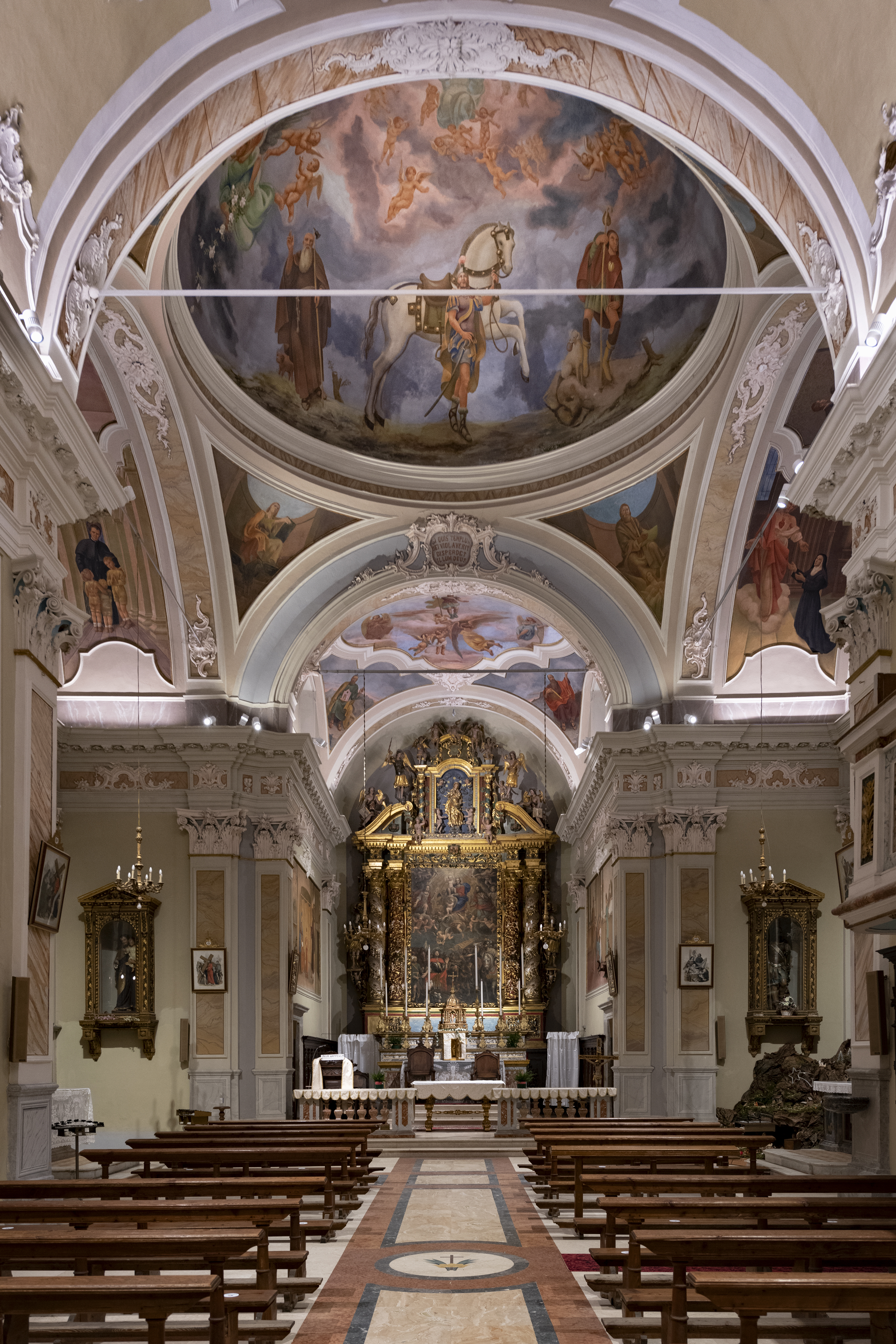 L'interno, di stile barocco, è a una navata con quattro altari laterali e cupola ottagonale. La pala dell'altar maggiore "Martirio di S. Maurizio" del Bate, è del '600 ed è inserita in un'ancona lignea attribuita alla bottega Ramus; all'interno vi sono altre tele del Gandino e del Cossali.